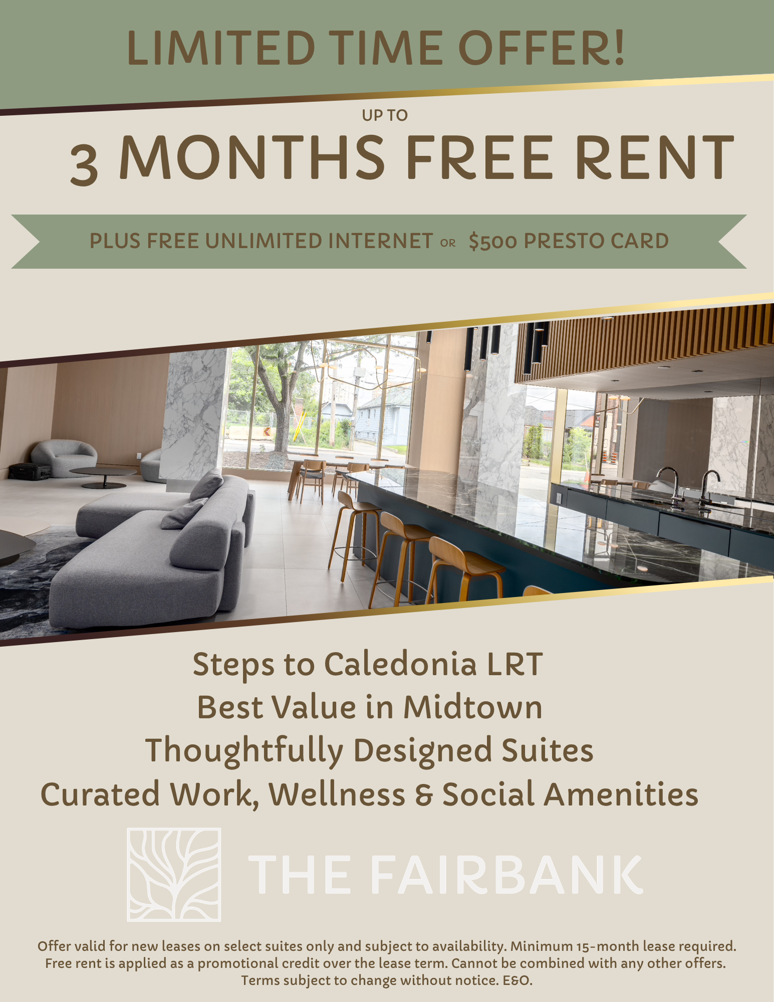 Discover the unfettered freedom of rental living on Eglinton West—where you’ll be steps away from the future Eglinton Crosstown LRT. The Fairbank stays connected and stands apart. A retreat from the city, in the city.